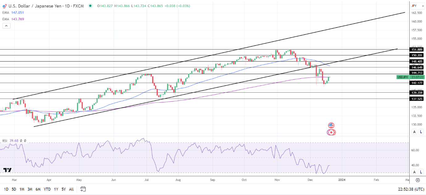 14天RSI为39.68,表明美元/日元在进入超卖区域之前跌至142.177支撑位。