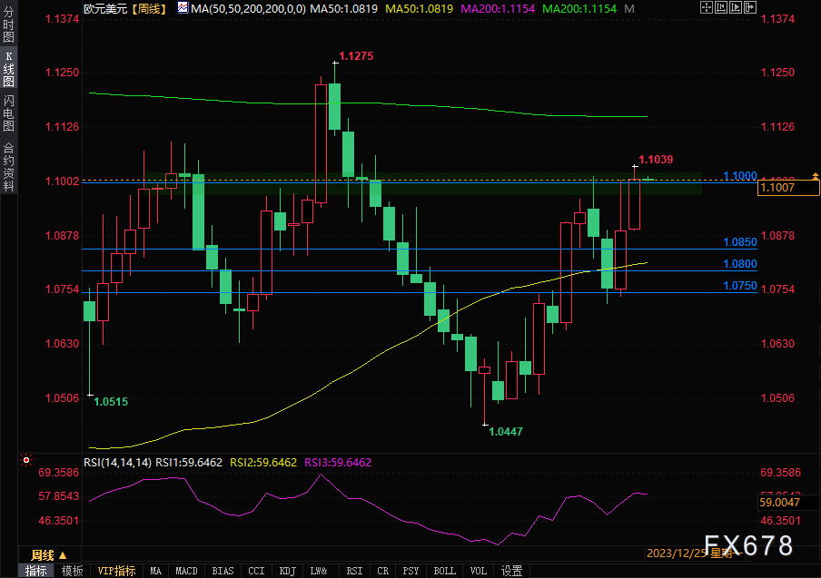 欧元上周表现强劲,突破1.10关口,这是一个重要心理关口,与200周均线重合。正处于圣诞假期中,流动性压力可能出现,但短期下跌可视为买入机会。