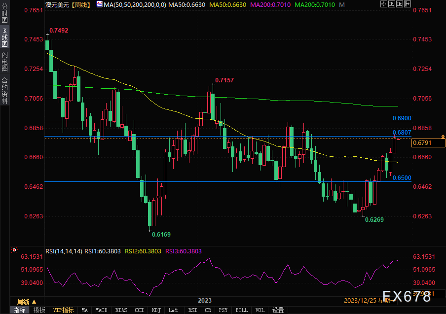 过去一周,澳元/美元强势反弹,突破0.68阻力位。澳元/美元下一阻力为0.69,这是此前的阻力位和200周均线位置。如果突破这一阻力,汇价有望向0.7150移动。上周k线呈现明显看涨情绪,随着投资者关注美联储2024年降息的可能性,澳元维持了上涨行情。