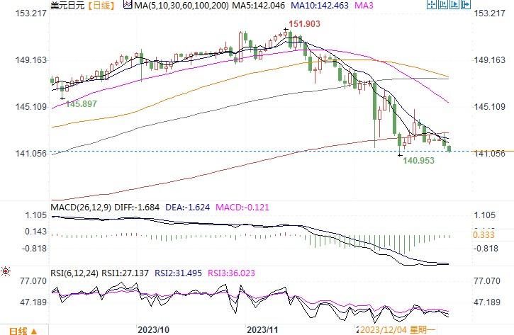 周三(12月27日),美元兑欧元和一篮子货币周三跌至五个月低点至100.98,为7月27日以来最低,美元兑日元也下跌0.35% 至141.89。年低美元的这波走低,主要是因市场预期美联储可能很快降息。美联储主席鲍威尔在12月会议上出人意料地表现出鸽派态度后,市场对联储3月降息的预期升温,当时决策者预计2024年将降息75个基点。而包括欧洲央行在内的其他主要央行则保持了维持较高利率更久的立场。与此同时,日本央行也表示,更接近于结束负利率政策,尽管坚称并不急于做出调整。日本央行周三表示,将在1-3月季度的常规操作中减少债券购买量。日本央行12月18-19日会议的意见摘要也显示,日本央行决策者认为目前有必要维持超宽松货币政策,一些决策者呼吁就未来退出大规模刺激政策进行更深入的讨论。种种迹象表明,日本央行似乎已开始做出结束负利率的准备。日内将有日本工业生产和零售销售数据公布,留意数据对日元的影响。日线图上,经旗形整理后,美元/日元延续下行,若前期低位140.95失守,汇价降有望下探140-138区域。上方目前在145之下有着较强的阻力。