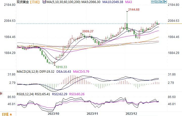 ——周四(12月28日),金价回落,稍早曾触及逾三周最高2088.29美元,尾盘下跌0.4%,收盘在每盎司2,069.79美元。当天美元和美国公债收益率探底回升催动了黄金一定程度的获利调整性下跌。