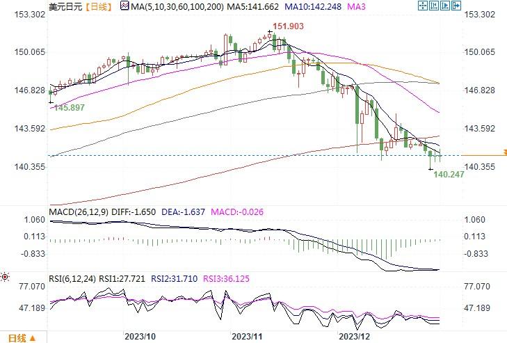 周一(1月1日),美元兑日元开年的第一个交易日波澜不惊,收盘价略低于141报140.87水平。市场预期日本央行将在2024年退出负利率政策,但该央行继续坚持其鸽派立场,而且几乎没有提供任何关于这种情境是否会发生以及如何发生的线索。进入2024年,日本的前景似乎令人鼓舞,预计经济将强劲增长,通胀也将改善,而且有迹象表明通胀是可持续的。因此存在着结束负利率时代的必要性以及可能性。尽管如此,即使日本央行加息至正值,其利率仍将远低于美国。富瑞金融集团表示:“在整个2024年,如果他们加息至正0.5%,我会感到有点惊讶,但也许会发生。这种日元的持有成本非常高。”日元是一种受欢迎的融资货币,新的一年里投资者利用做空日元的收益来购买其他资产的观念恐怕也不是一时间就能发生大转变的。除非2024年里,日本央行显示出坚定且力度较大的货币调整,否则日元保持大幅升值的基础仍不够厚实。日线图上,美元兑日元的技术指标平滑异同移动平均线MACD的信号线呈钝化状态,相对强弱指数RSI也在超卖临界线出现停顿的状态,显示该货币对的下行力度有所减弱。目前下方的关键支撑在140,下穿则美元跌势将进一步延展。而上方一旦穿越145,那么美元/日元的跌势将可能发生反转。