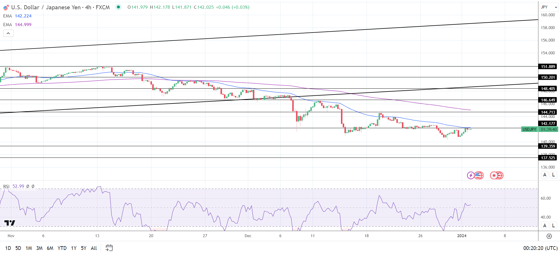 周三(1月3日)亚市,美元/日元报在141.91,多头情绪浓烈。日本7.6级强震延烧,以及羽田机场两架飞机相撞造成5人罹难,导致日元短线走跌。展望后市,美国本周“鹰派”数据可能推迟降息预期,意味着美元买盘将回流。另外,美国非农就业报告(NFP)和FOMC会议纪要将发布。