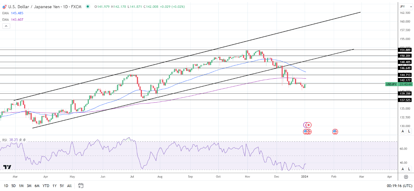 14天RSI为38.25,表明美元/日元将跌破141关口,然后进入超卖区域。