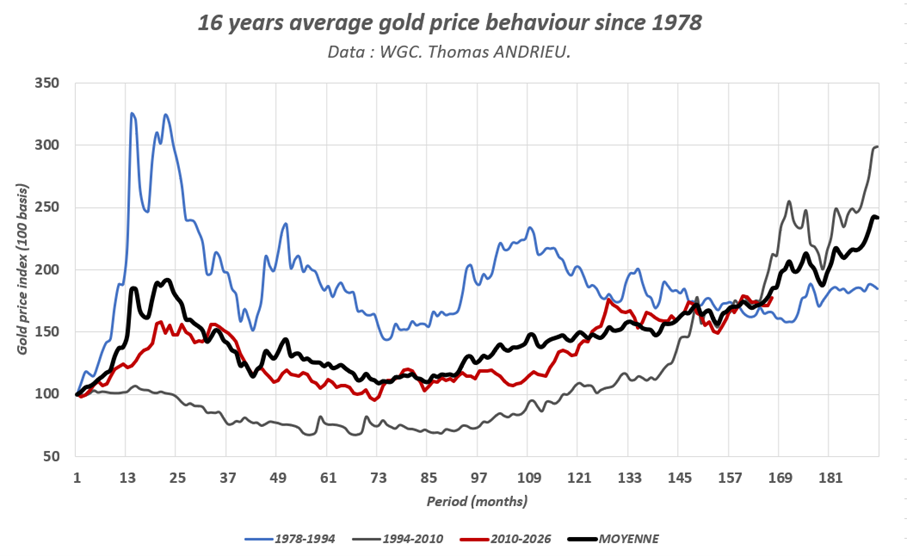 安德鲁提出了自1978年以来记录的黄金价格三个16年周期,并对其演变交叉比对。他解释说:“我们立即可以看到,16年来金价的平均走势与2010年以来金价的走势之间存在显着的对称性(图表中的红色和黑色曲线)。”
