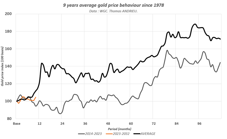 如果将金价分解为9年周期,则金价的平均走势(黑色曲线)与上一个周期(2014-2023年)显着对称。