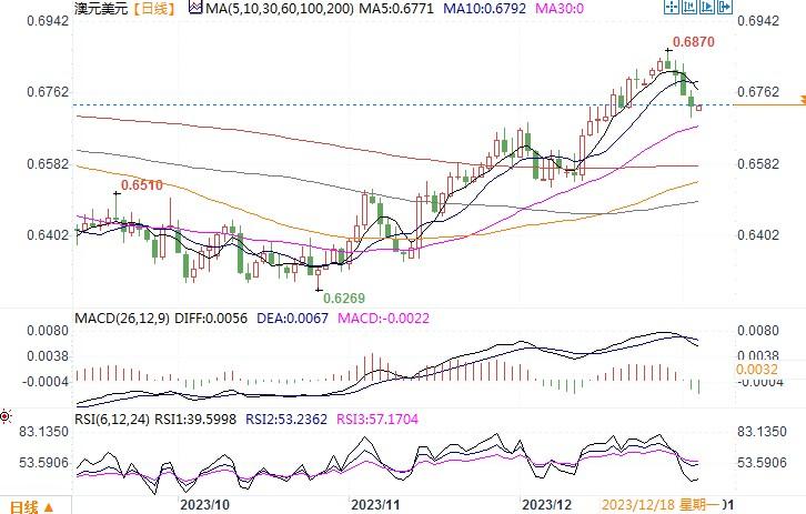 周三(1月3日),澳元兑美元下跌0.4%,低收盘在0.6732。隔夜全球股市从高位回落,美债收益率继续上升支撑美元持续反弹,给到风险货币压力。年初以来,交易商也开始降低对美国未来一年提前大举降息的押注,此举令美元的压力得到缓解并开始出现发力反弹的行情。虽然周三美联储12月份会议纪要表态了货币政策“限制性过度”可能对经济造成损害,不过,与会决策者还是强调货币政策在一段时间内保持限制性立场是合适的。说明美联储尚未有降息的考虑,这或可能迫使交易员不得不调整对美元利率下降的重新定价。目前投资者都屏息等待周五美国的非农就业数据,以确立美国经济和货币利率的走向。日线图上,澳元/美元跌破21日均线(今天在0.6730),各项技术指标转向下行,似乎确认上涨趋势结束。下一支撑位在10月至12月升势的38.2%回档位0.6641。