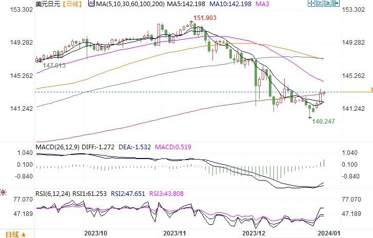 周三(1月3日),美元周三升至两周高点报102.45,盘中一度触及两周高点102.61。美元兑日元尾盘上涨0.9%,报143.31,有望创下10月底以来的最大单日涨幅,盘初一度触及143.73的两周高点。周三公布的美联储12月12-13日会议记录显示,决策者上月似乎愈发相信通胀正在受控,“上行风险”减弱,而且愈发担忧货币政策“限制性过度”可能对经济造成损害。不过,与会决策者“强调货币政策在一段时间内保持限制性立场是合适的,需要保持到通胀明显持续地朝着委员会的目标下降”。年初美元强势的最大驱动力是市场对美联储2024年政策预期的普遍重新定价,交易员有关美联储将在2024年进行多达六次每次25个基点的降息的预期过于激进,过去几天,他们一直在部分削减这些头寸,投资者也继续对去年底累积的美元空头头寸进行获利了结。但是,当日公布的12月美国制造业采购经理人指数(PMI)连续第14个月低于50、11月美国职位空缺连续第三个月下降,仍不能打消美联储将会降息的预期,美元的升势也因此受到一定的抑制。在美元猛烈的空头回补力量推动下,日元年初交易里出现急速的溃退。这主要还是因为,投资者不能从日本央行获得明确的结束负利率的表态和举动。日线图上,美元/日元穿越了布林带中轨线,各项技术指标有从超卖区域掉头向上摆趋向,显示美元空头回补势能较强。上方若彻底穿越143,上方进一步的目标在145,更进一步的目标在147-148区域。下方目前来看140成为了阶段性较硬实的底部支撑。