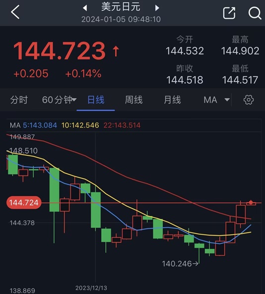 周五(1月5日)亚市盘中,美元/日元交投在144.70附近,较2023年底的141.04飙升逾360点。