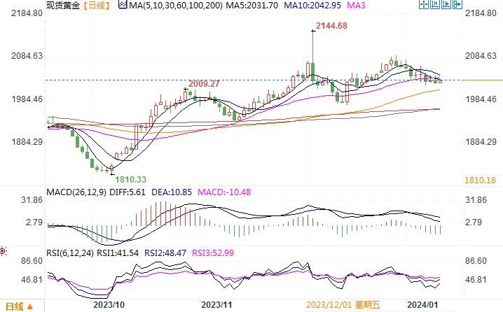 黄金的下跌,主要是指标10年期美国公债收益率上涨,稍稍压抑了黄金的吸引力。即便如此,黄金还是稳住在2020美元关键的支撑之上。这主要是投资者对于周四即将要公布的美国12月份通胀数据-消费者价格指数(CPI)还是充满着期待。美国消费者通胀数据将于周四公布。路透访查的经济学家认为12月物价同比涨幅将为3.2%,但认为核心通胀可能降至3.8%,将为2021年中期以来的最低水平。纽约联储的一份报告显示,消费者预期通胀将下降。而且美联储理事鲍曼周一表示,联储的货币政策似乎具有“足够的限制性”。因此,冷于预期的通胀数据将使美联储有更多理由在今年降息,这应该会推动金价攀升。然而,我们不得不注意的是,进入新年以来,画风似乎有所转变。就业数据增长强劲以及房地产抵押贷款利率仍因房屋销售良好居高不下,显示美国通胀仍具粘性的迹象,为美联储在更长时间内维持较高利率提供了更多空间。交易员们也似乎稳步削减对美联储最早可能在2024年3月开始降息的押注。况且美联储官员至今还在反对提前降息,亚特兰大联储主席博斯蒂克就表示,他仍然倾向于货币政策在短期内保持紧缩。尽管美联储已暗示最终将在2024年降息,但其并未提供有关降息时间的信息。迄今为止,央行一直维持着很大程度上由数据驱动的降息方法。因此,高利率维持的时间延长,就阶段性而言,对黄金是构成压制影响的。