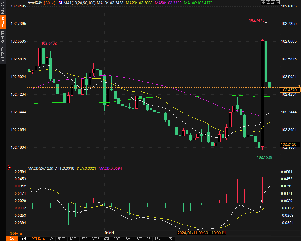 现货黄金30分钟走势图来源易汇通美元指数短线上涨超过40点,最高触及102.62,交投于102.5489附近。