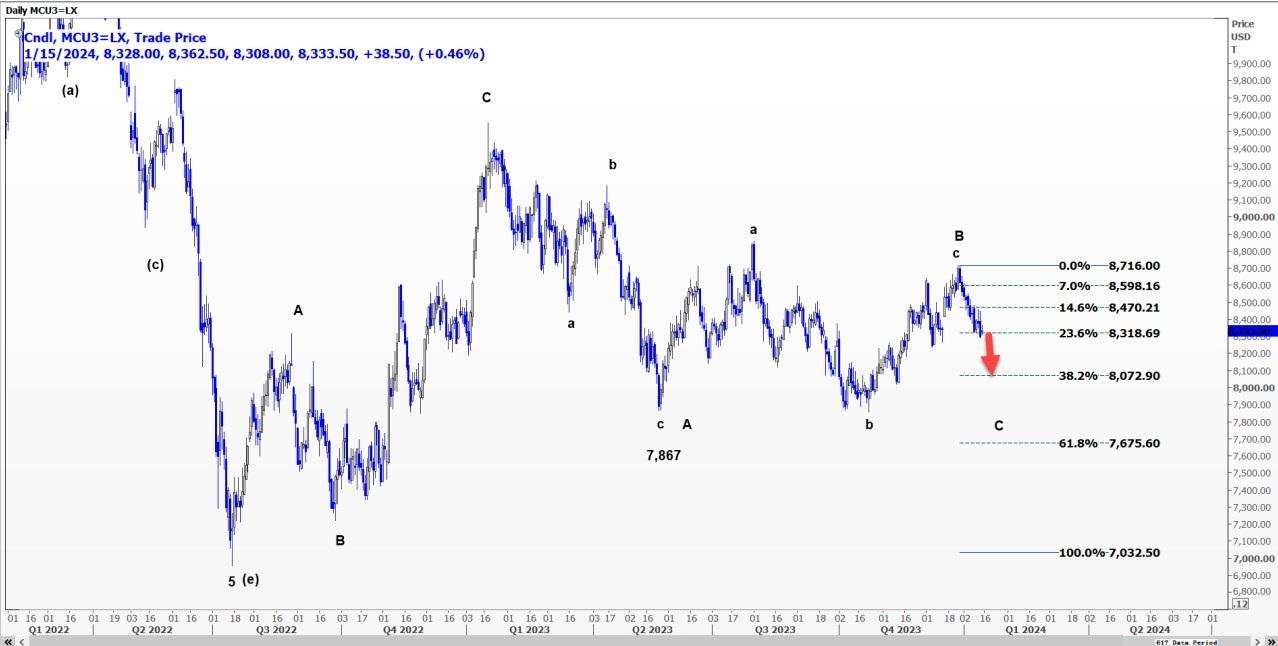 该合约正处于8716美元起的C浪中,预计将进入7675美元至8073美元的宽幅区间。该支撑引发了微弱反弹,最终收于8470美元附近。