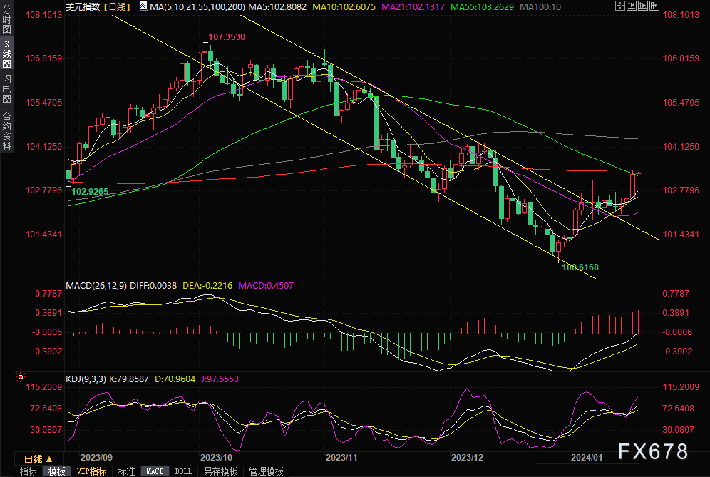 ——美元出现10个月来最大涨幅,原因是交易员质疑市场消化的美联储降息幅度,同时地缘政治紧张局势提振了对这种避险货币的需求。美元指数周二(1月16日)上涨0.73%,为去年3月以来的最大涨幅,收报103.33,美元兑全球主要货币均走强。技术面来看,美元指数已经顶破了11月初以来的下跌通道。本交易日将迎来美国12月份零售销售月率,俗称“恐怖数据”,投资者需要重点关注。