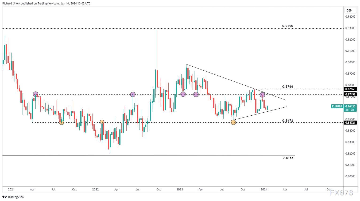 欧元兑英镑在较长的周时间框架内呈现出一种不对称三角形的交易趋势。本周欧元兑英镑从趋势线支撑位反弹,但动能仍令人担忧。