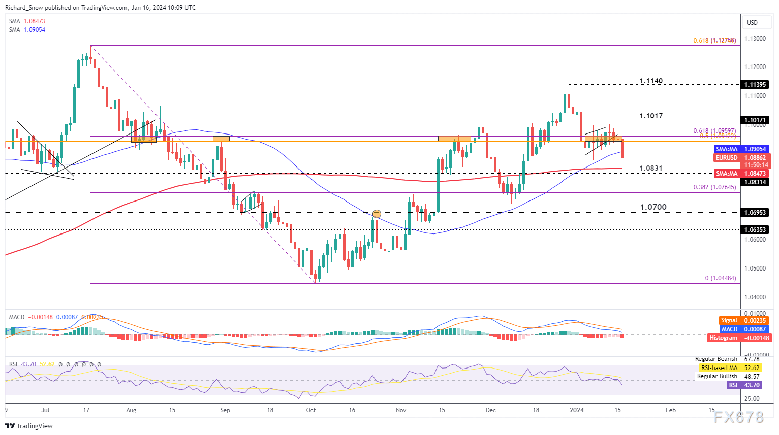 ——周二(1月16日),欧盘时段,欧元/美元震荡下跌,盘中报1.0887,跌0.55%。欧元/英镑震荡上涨,报0.8610,涨0.12%。欧元主力报1.0916,跌0.62%。