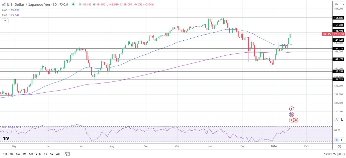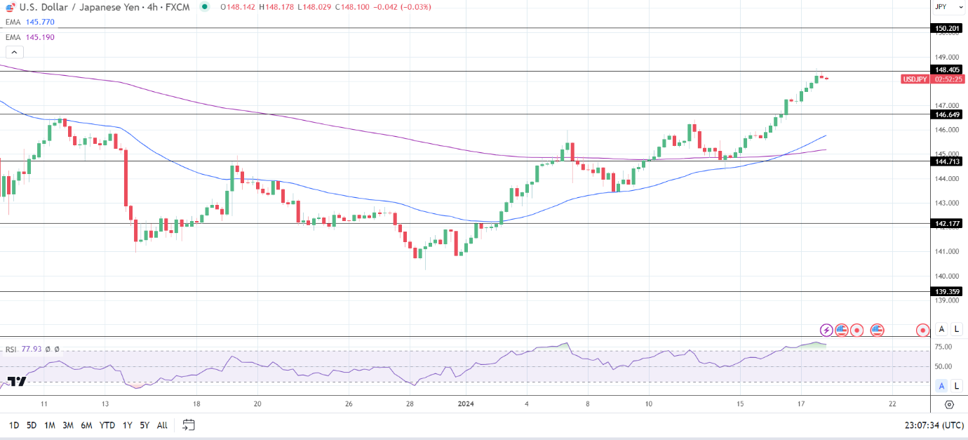 14天RSI为65.68,表明美元/日元突破148.405阻力位,然后进入超买区域。