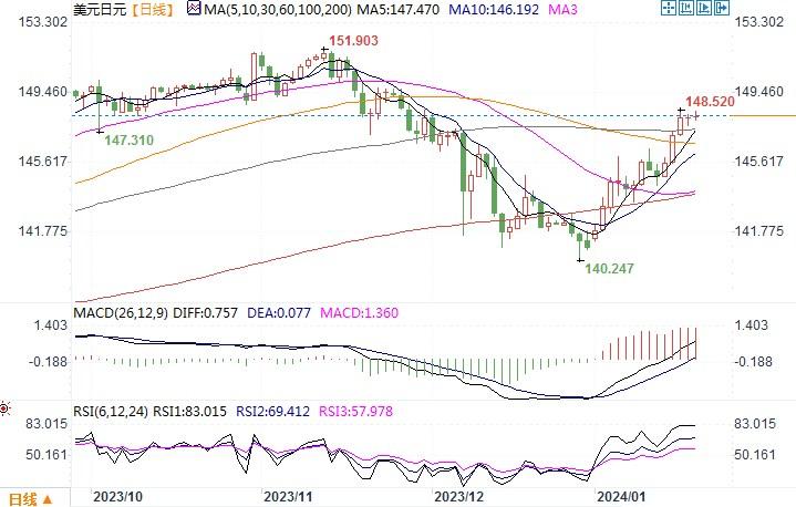 周四(1月18日),美元指数周四连续第五个交易日攀升,当日上涨0.14%报103.47。美元兑日元基本持平,收盘在148.14,周三曾升至148.52,为11月28日以来最高。美国劳工部周四表示,在截至1月13日当周,初请失业金人数减少了1.6万,经季节性调整后为18.7万,为2022年9月以来的最低水平,低于接受路透调查的经济学家预期的20.7万。超预期良好的失业数据,使美联储降息的预期进一步受到抑制。此外,包括美联储理事沃勒在内的美联储官员本周反驳了美联储将进行一轮激进降息的预期,暗示降息的时间将比市场参与者最初预计的晚,速度比市场预期慢。美元也是因此受到较大的抬捧而走升。日本央行定于下周一和周二召开政策会议,市场预计可能会维持超宽松货币政策不变。本周剩余交易日里,交易员暂时持盘等待着会议的结果。若日本央行果真维持宽松不变,料日元兑美元将继续走弱。日线图上,美元/日元走势斜率过陡,短线或有调整的变化。而一旦企稳147-148区域,那么上方则有望攻击150水平。
