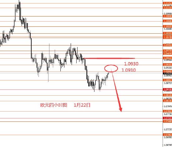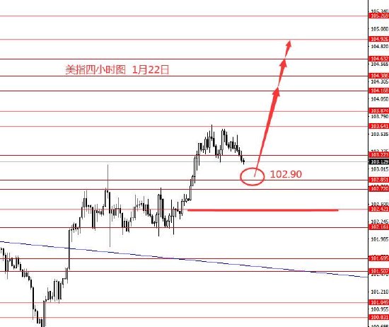 1月22日,美指向上拉涨,附合预期收阳柱。从图形来看,本周下方重点关注102.40一线强支撑,以上偏向于看涨,若成功跌破,再留意波段性下跌行情。本周操作策略:102.90附近做多,止损102.30,目标看向103.80和104.20和104.90附近。但在实战操作上,个人建议等待102.90-103.00附近出现向上信号后,再右侧进场做多,这样止损不用摆这么大,可以小一些,止损的概率也会低些。控制仓量,严格止损。