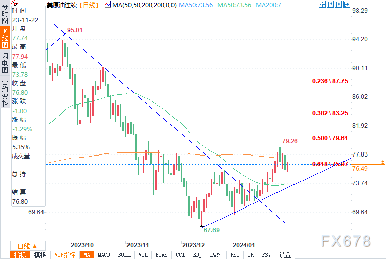 ——周四(2月1日),美盘时段,美原油连续震荡走高,盘中报76.65美元每桶,涨幅1.11%。价格在三次测试76.5美元关口后攀升至目前价格。油价上涨,受美联储降息预期提振