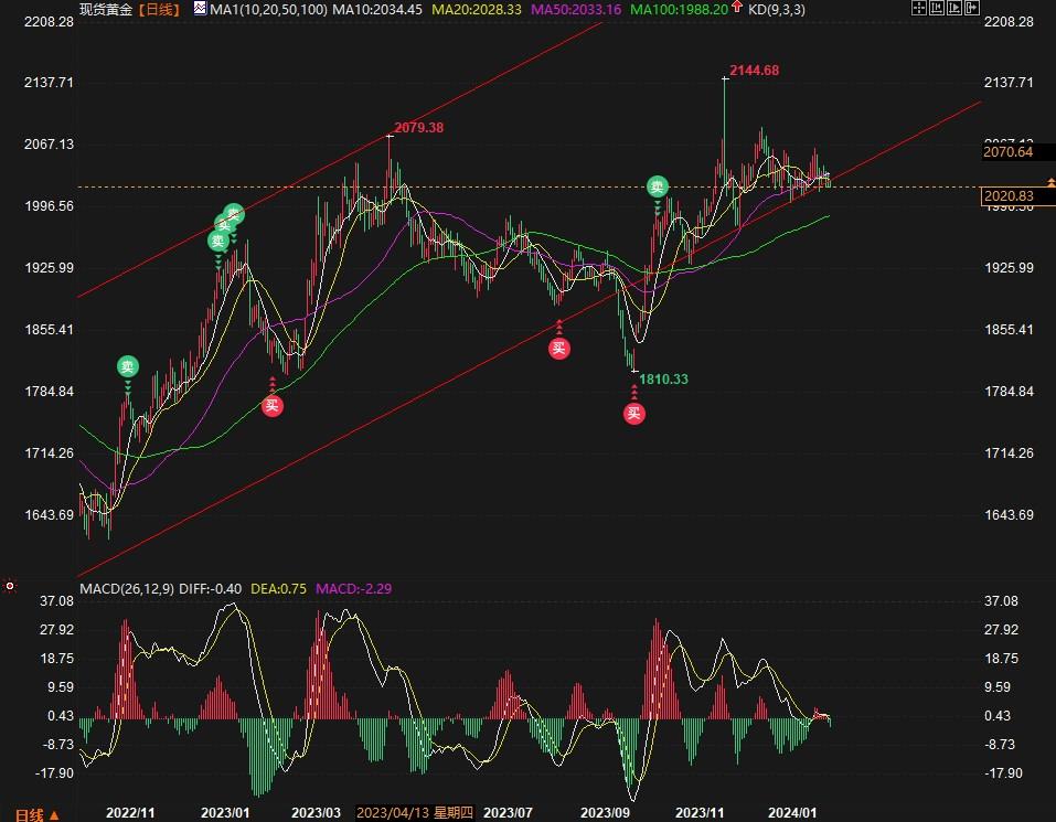 目前,黄金价格已跌破2023美元/盎司的关键支撑位,预示着新的下跌趋势即将展开,目标直指2000美元/盎司大关。在此过程中,2010美元/盎司的整数关口将考验黄金看涨阵营的承诺。