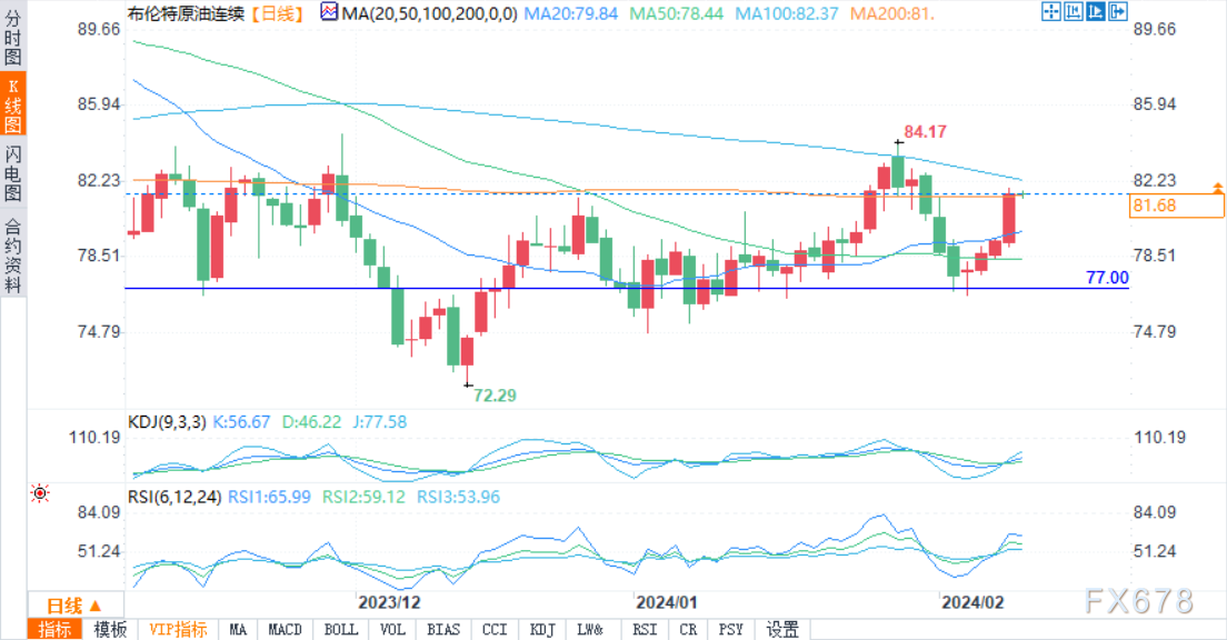 技术分析布伦特原油在82美元关口之前测试200日简单移动平均线(SMA),可能达到83.50美元,但美元走强可能会开始打压油价上行潜力,尤其是即将公布的美国基本面数据继续跑赢大盘。支撑位出现在77美元。