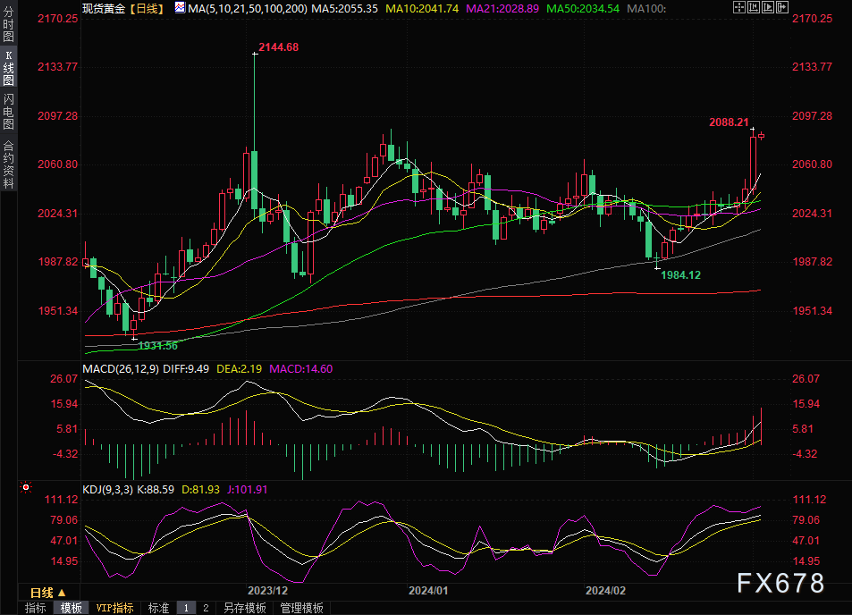 技术分析师指出,金价在上周五飙升后接近第二目标2095.00美元/盎司,受看涨的技术面推动,金价后市可能还有进一步大涨的空间。预计,受此前完成的头肩底形态的影响,金价将继续升势,并进一步升至历史高位2144.60美元/盎司。