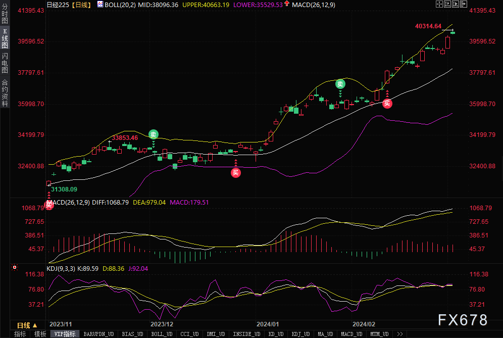 (日经225日线图,来源:易汇通)“日经225指数4万点肯定是一个关键的心理关口,这可能给该指数带来一些阻力,并带来波动,”盛宝资本市场驻新加坡策略师Charu Chanana说,“但如果结构性因素仍然有利,日元继续走软,这可能更多地是一个看涨信号,而不是加剧对日本股市超买的担忧。”