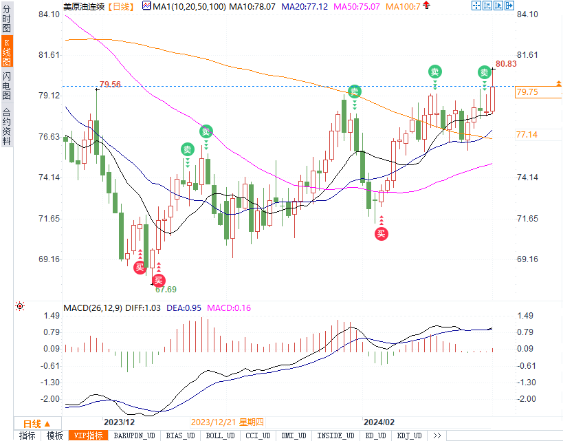 WTI4月原油期货收涨1.71美元/桶,涨幅接近2.19%,收报79.97美元/桶,截至发稿,现报79.76美元/桶,涨幅1.91%。