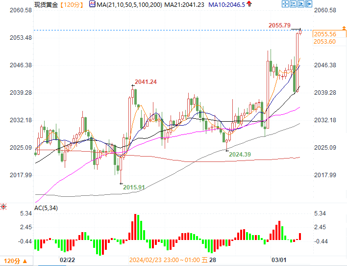 ——现货黄金在周五(3月1日)欧洲时段涨幅扩大,自北京时间17:00至19:00,上涨15美元,涨幅0.74%。截至北京时间19:09,现货黄金报2055.14美元/盎司,日内上涨逾11美元,涨幅0.56%。