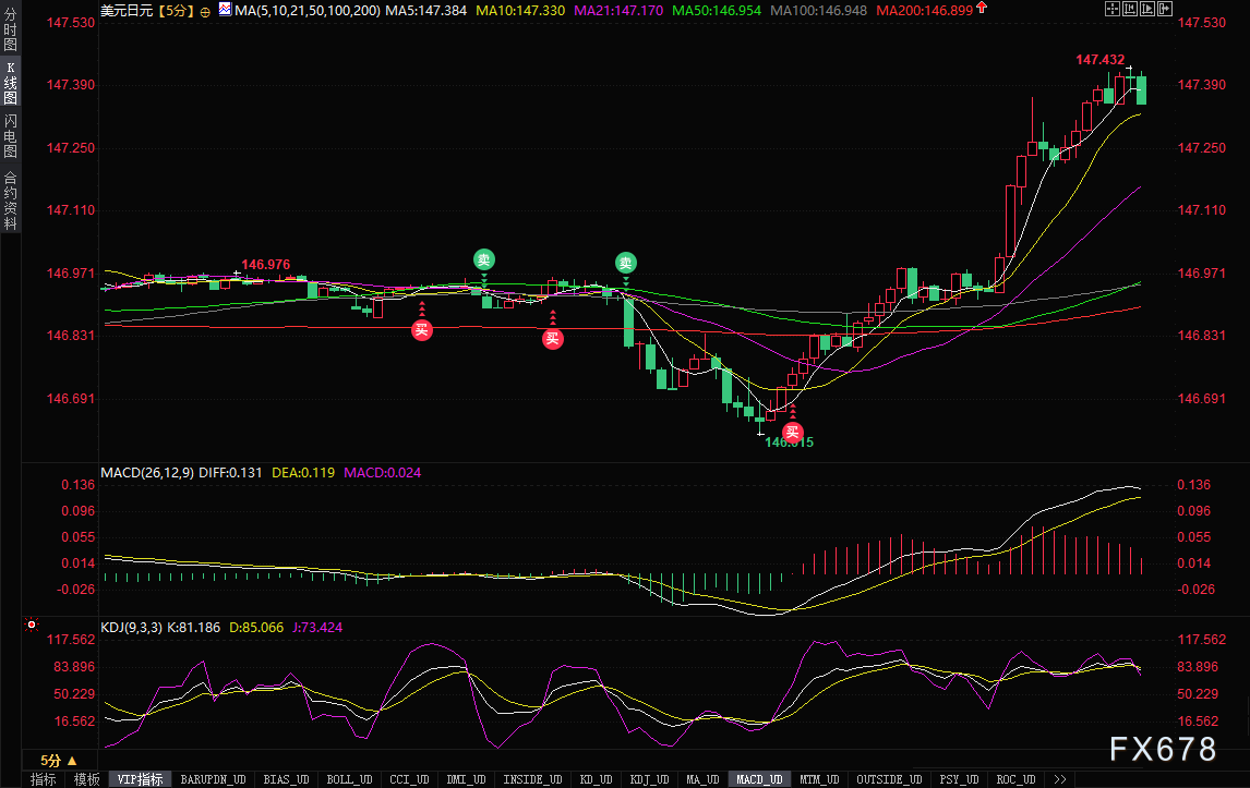 (美元兑日元5分钟图,来呀:易汇通)