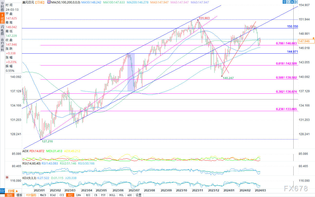 ——周三(3月13日),美元兑日元盘中上涨,报147.970/982,涨幅0.25%。美元兑日元测试了146.65-148.28的区间阻力。汇率从2月底高点的回调在200天简单移动平均线(SMA)附近停止。市场参与者可能在为未来的关键事件做好准备,包括工资谈判结果和下周的央行会议。