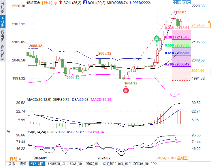 经过对日线图的深入分析,我们观察到金价自关键支撑位2145美元/盎司附近出现反弹。这一位置不仅是3月7日和2月14日低点的交汇点,还对应着自历史高点2195美元/盎司至1984美元/盎司的反弹走势的23.6%斐波那契回撤位。