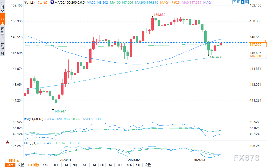 (美元兑日元日图 来源:易汇通)美元兑日元周四上涨小幅上扬,价格在147.50-148阻力区域内。如果价格在短期内能够保持在147.50之上,我们可能很快就会看到它向50日简单移动平均线148.35移动。如果价格继续走高,焦点将转移到148.90和149.70。