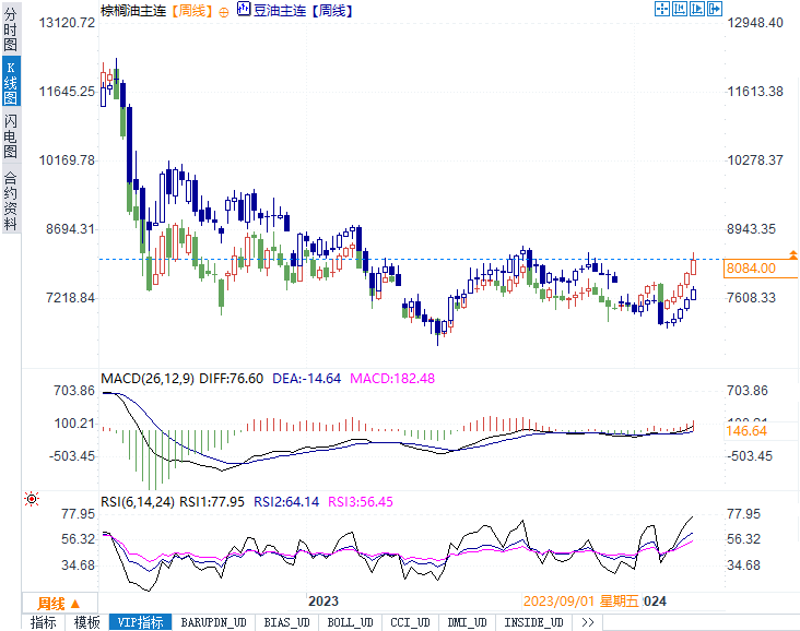 (大连豆油、棕榈油周线走势图)