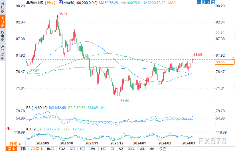 另一方面,零售销售增长低于预期。这些数据迫使市场重新考虑美联储的预期,6月降息的可能性下降到60%。2年期国债收益率飙升至4.70%,10年期国债收益率飙升至4.30%,美元指数急剧上升,股市下跌。所有的目光都聚焦在下周的FOMC会议上。美联储将更新其点阵图,因为最近两个月来通胀飙升,就业数据强劲,国内生产总值相对强劲。我们可能会看到美联储成员的中位预测显示今年只有两次降息,而不是在去年12月的点阵图中的三次降息。我们将带着鹰派的倾向进入下周的FOMC会议,美联储不早行动总比在路上被迫掉头要好。WTI原油
