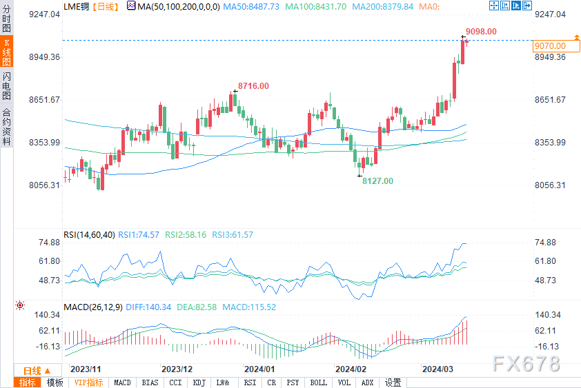 截至3月中旬,铜价触及2023年4月以来的最高水平。价格此前在2月初触底,随后强劲的上行动能在长期横盘趋势中推翻了之前的峰值。尽管整个2月份价格环比小幅下跌1.74%,但3月份的前两周上涨了 4.12%。