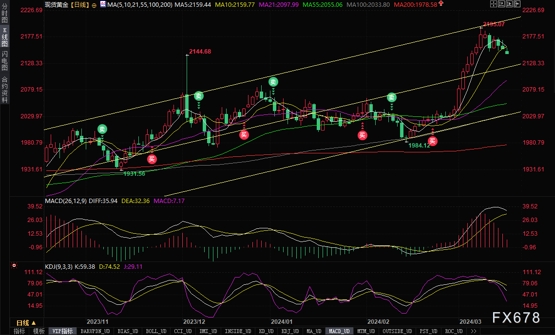 Kitonyi指出,在日线图上,黄金价格似乎仍在一个急剧上升的通道中交易。14日RSI在上周五反弹至超买状态,然后试图回撤。因此,黄金空头将把长期获利回调目标定在2123美元/盎司左右,或更低的2080美元/盎司。另一方面,黄金多头将把反弹目标定在2199美元/盎司左右,或更高的2243美元/盎司。