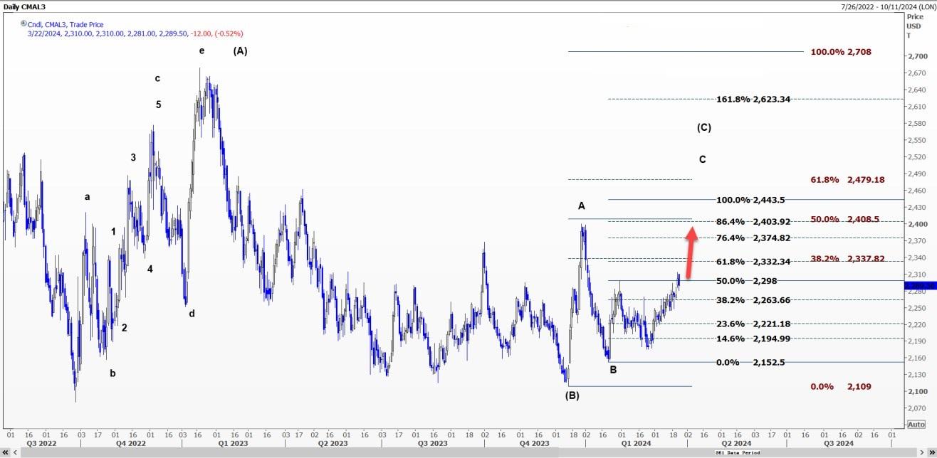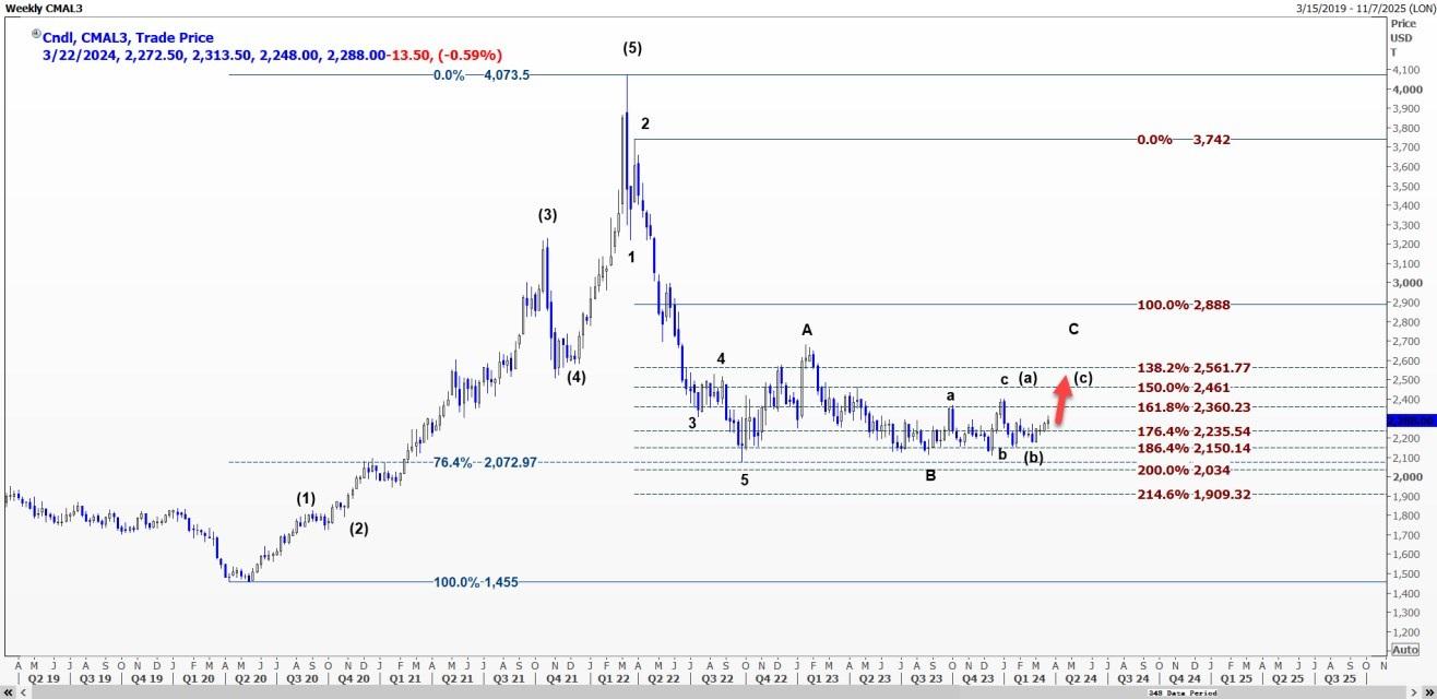 对日线图修正波周期的详细研究揭示了自2109美元开始的大波(C)的进展。对这一波的预测分析显示目标为2479美元,即61.8%的水平。
