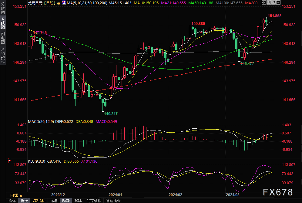 美元兑日元日线图,来源:易汇通北京时间11:31,美元兑日元现报151.36/38。