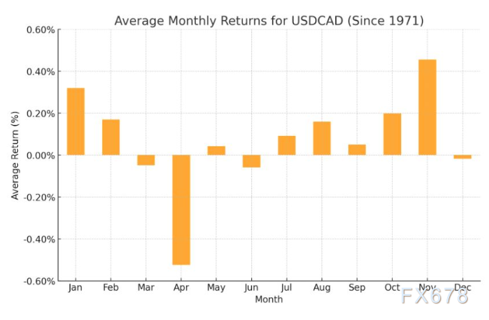 从1971年至今的数据显示,加元在4月份表现出显著的季节性动态,平均上涨超过0.5%。这一趋势在近年来持续,加元兑美元汇率接近测试去年11月以来的最高水平。