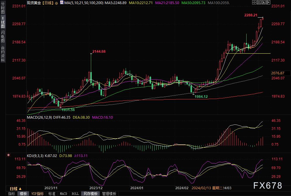 ——金价周三(4月3日)续涨,现货黄金盘初曾触及2288.21的历史高点,随后一度回落至2277附近,但目前再度回升至2285.49美元/盎司附近,受美元走软和中东紧张局势升级带来的避险需求提振;投资人则期待更多美国经济数据以寻找政策线索。