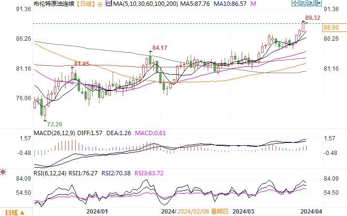 布伦特原油连续日线图来源:易汇通北京时间4月3日10:40 布伦特原油连续 报 88.99 美元/桶