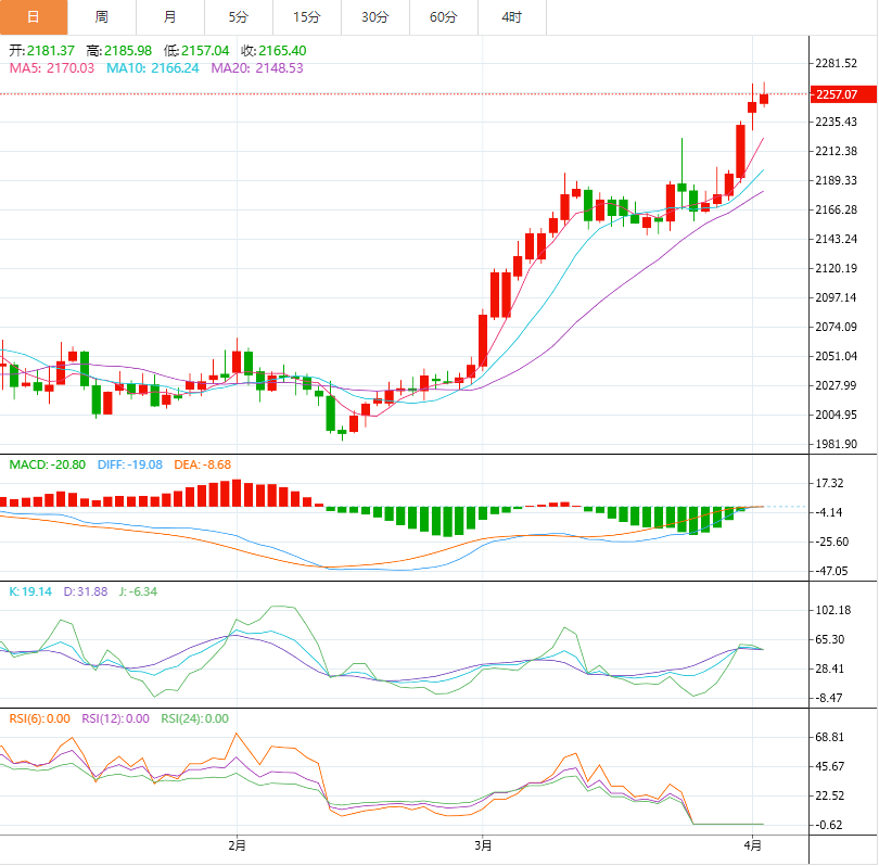 ——周二(4月2日),金价连续三个交易日创下新高,这主要是由于动量跟踪基金的需求有效抵消了美元走强以及美国利率长期走高的可能性所带来的压力。尽管美元汇率上涨,但金价仍在周二继续攀升。截至发稿时,现货黄金价格上涨0.14%,至每盎司2254.08美元,此前曾触及每盎司2266.81美元的历史新高。