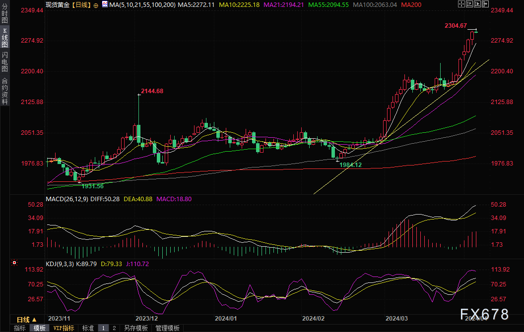 (现货黄金日线图,来源:易汇通)北京时间14:13,现货黄金现报2296.74美元/盎司。