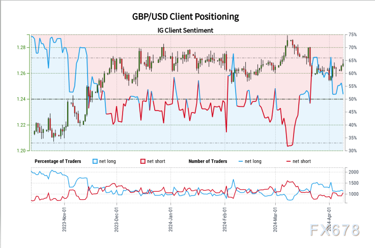 最近的IG数据表明,市场对英镑的态度发生了转变,自3月21日以来首次转为看跌。目前,有52.34%的客户在抛售英镑/美元,导致做空/做多比例为1.10:1。与昨天相比,净空头头寸增加了20.55%,比上周增加了33.60%,进一步证明了这种看跌倾向。