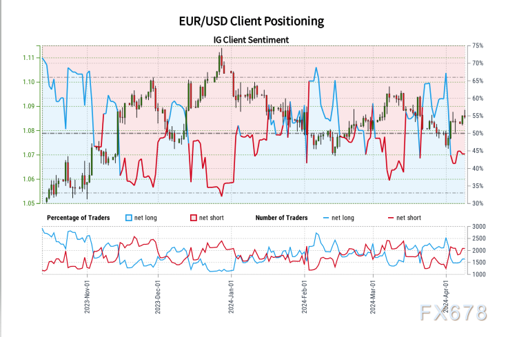 IG数据显示欧元/美元明显看跌。56.93%的交易者预计会下跌,创造了1.32比1的空头/多头比率。这种悲观情绪进一步反映在自昨天以来净空头头寸增加了14.69%,与上周相比大幅增加了54.22%。