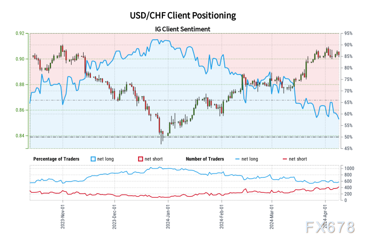 IG的专有数据显示,零售客户对美元/瑞郎有明显看涨倾向。目前,58.92%的人押注该股将进一步上涨,导致多空比为1.43比1。这种乐观情绪已经加剧,净多头头寸自周二以来增加了3.50%,与上周相比增加了10.06%。