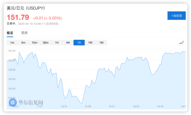 截至发稿,美元/美元汇率报151.79,徘徊于34年低位。将于今日公布的美国CPI通胀数据可能使日元兑美元汇率进一步跌破152,即日本财务省可能出手干预的位置。