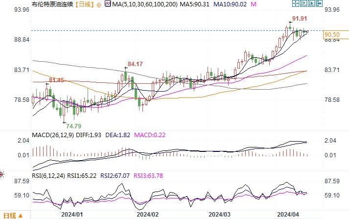 布伦特原油连续日线图来源:易汇通北京时间4月12日10:14 布伦特原油连续 报 90.57 美元/桶