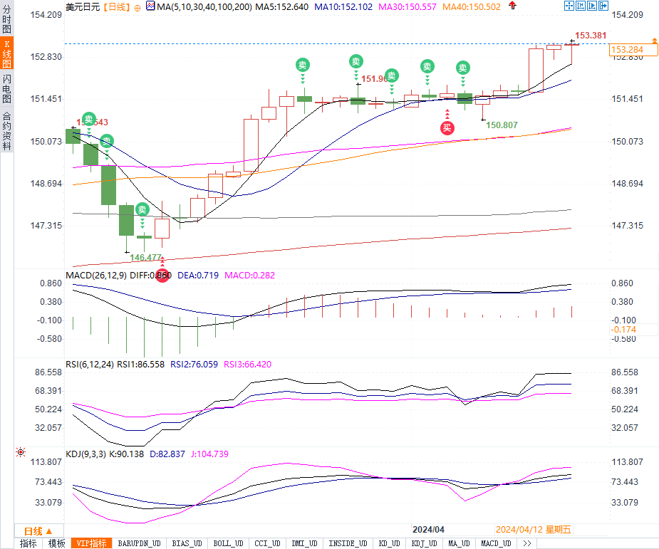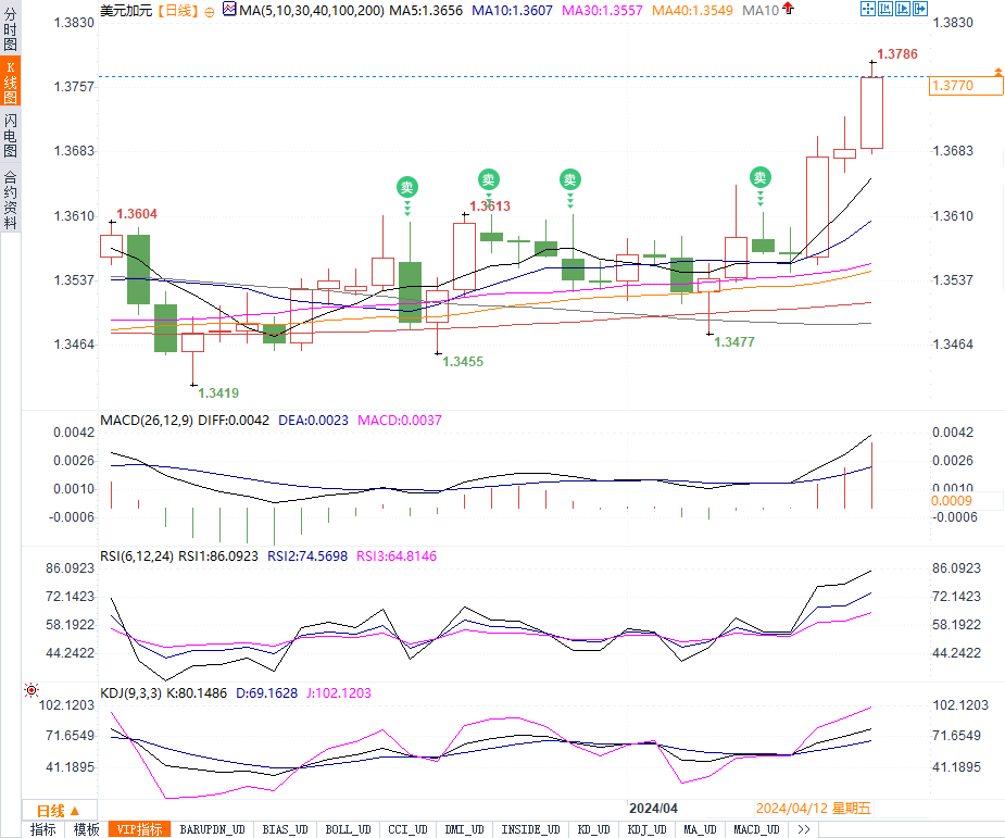 ——周五(4月12日),美国通胀走强,美联储加息的希望正在消退,美元连续狂飙,并巩固了其作为2024年表现最好的货币的地位。美元兑日元在周末前出现一波反弹行情,最终收市于153.25。市场对日本央行的潜在干预表示担忧。加元继续下跌,本周可能会下跌1.25%,这是自2023年5月以来最糟糕的单周表现。